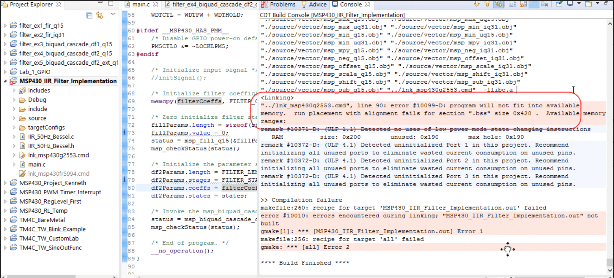 The MSP430G2553 also lacks a floating-point unit for processing non-integer values. The solution to this problem is to use fixed point values, but I am aware of the quantization errors that this can incur both at a data value and filter performance level. By the time I managed to work around the floating-point problem, each compile generated a LOW SPACE ERROR.