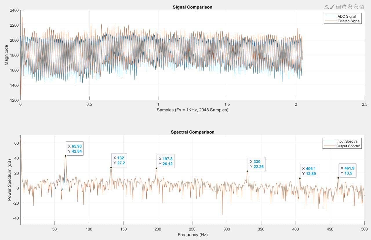 - I implemented 50 Hz and 60 Hz filters as separate 10th order Chebyshev Type I, Biquad IIR Bandstop filters. I designed the filters to provide 60 dB of attenuation in the 49 to 51 Hz and 59 to 61 Hz ranges.