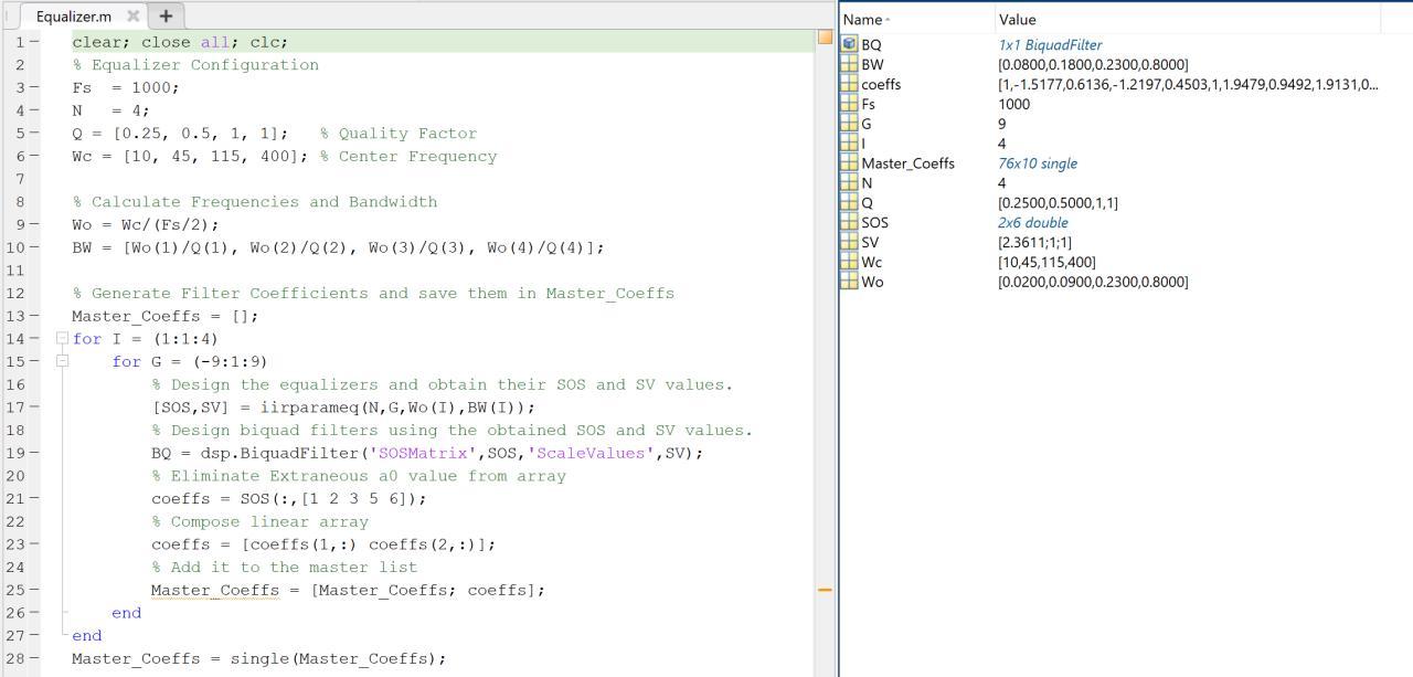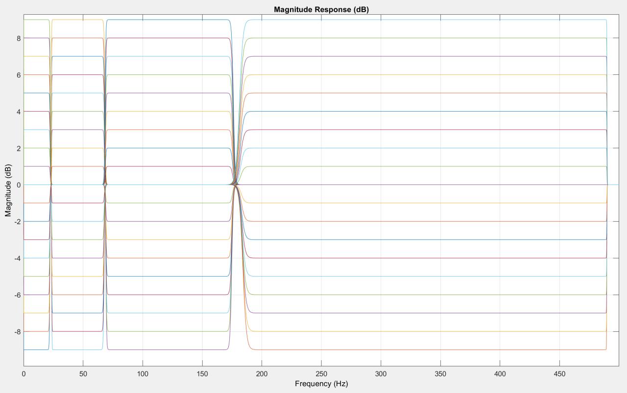 I previously developed a Matlab script to generate IIR filters specific to the frequency bands I wanted to target, automated the coefficient generation for each gain level (-9 to 9dB), and then generated the coefficients into a single precision floating point array exported as a C code. This script featured a serious bug that I spent my break chasing down.