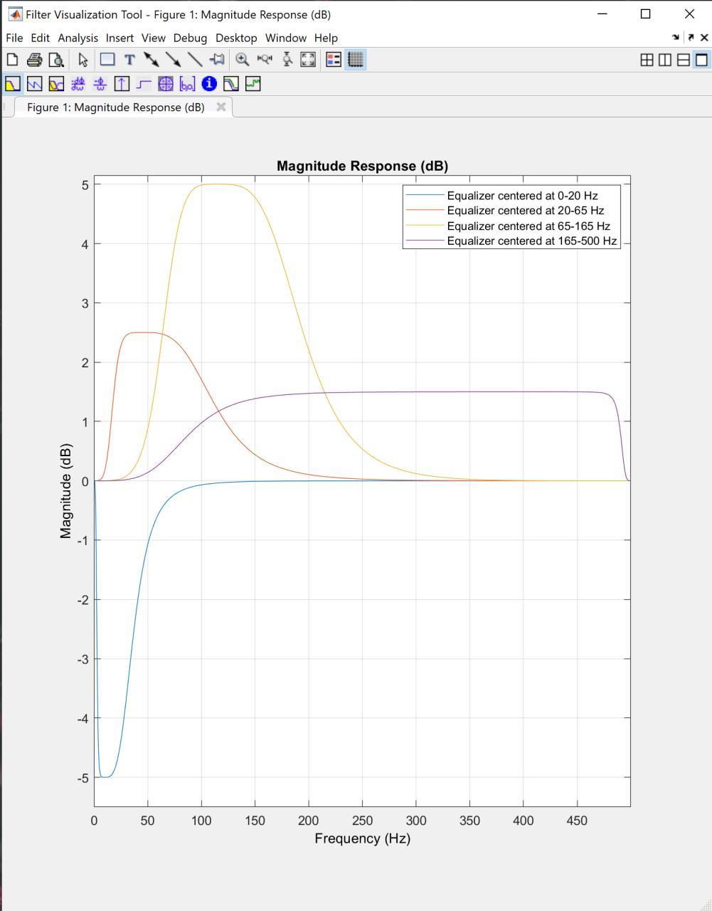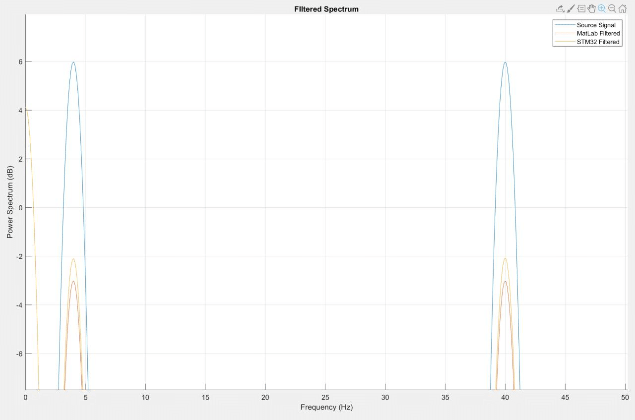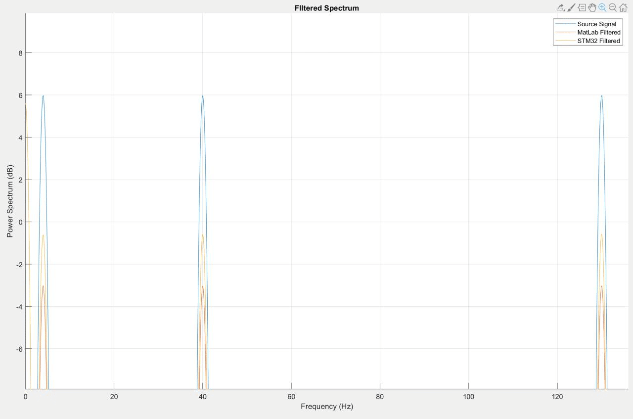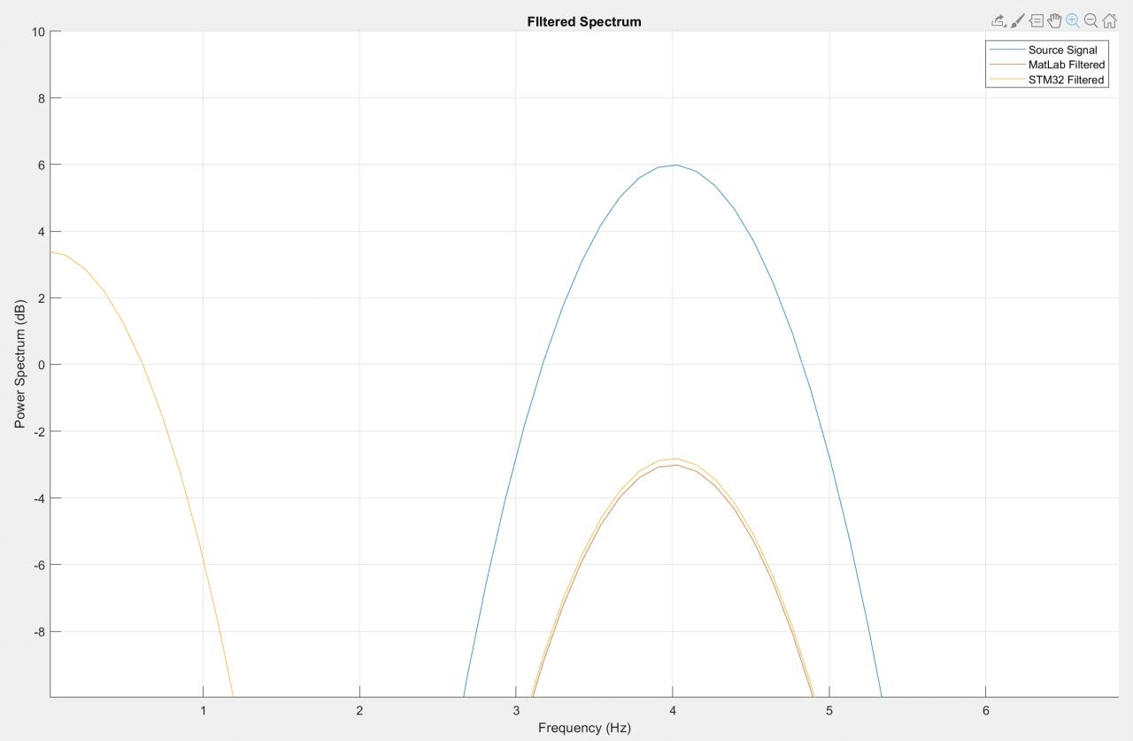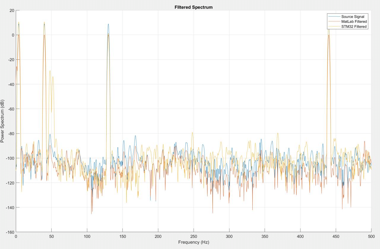 - I struggled really hard to find a way to implement an equalizer. This is in part because designing a solution in MatLab or Simulink does not necessarily translate to a functional design at a microcontroller level. My process involved three stages: (1) performing multiple FIR filter operations on a signal stored in memory to isolate specific frequency bands (2) multiplying these isolated bands by scalar coefficients to control the band gain (3) combining these output signals together to generate a final output. This is not only seriously memory and CPU intensive on a 168 Mhz MCU but also literally lacks CMSIS DSP functions to help accelerate the process.