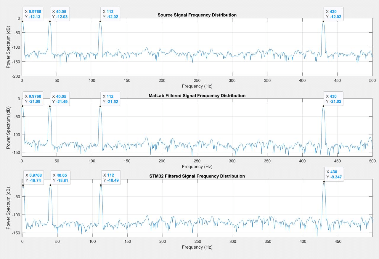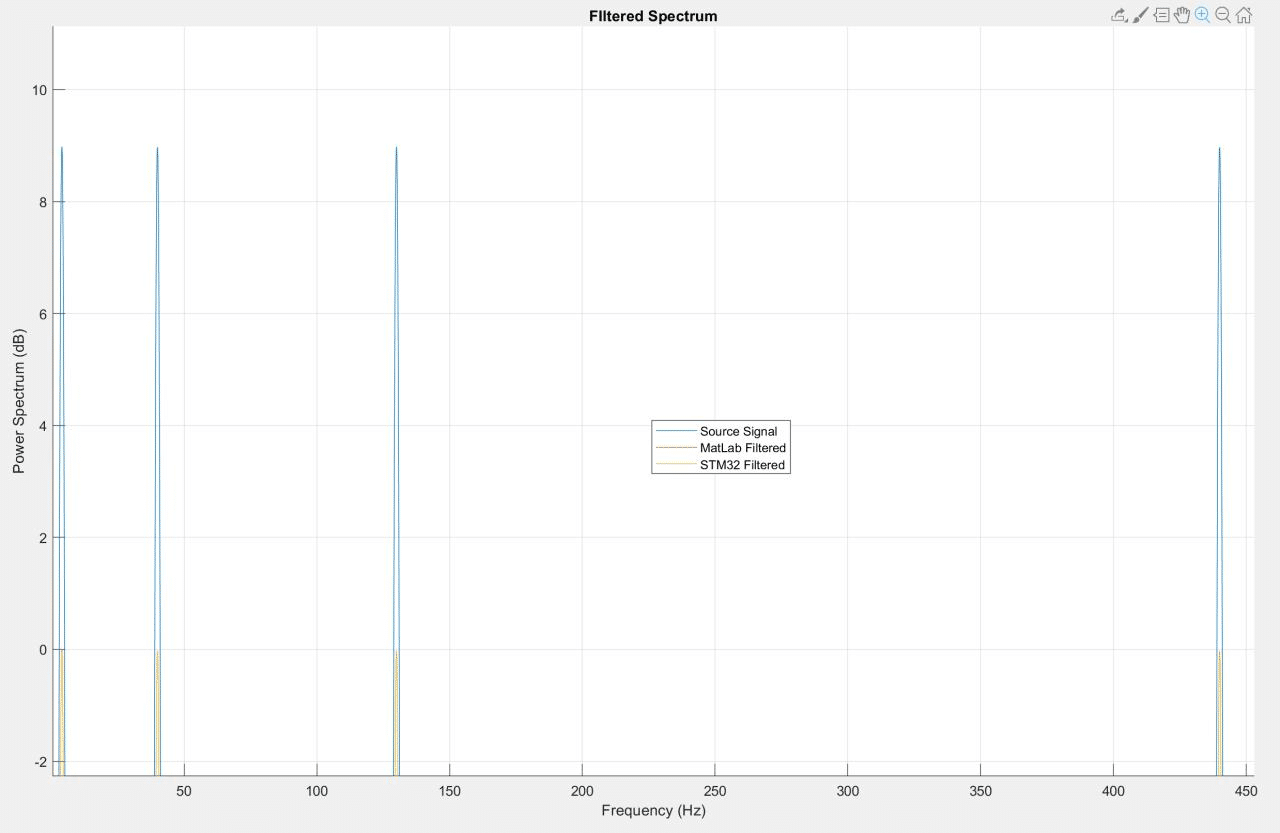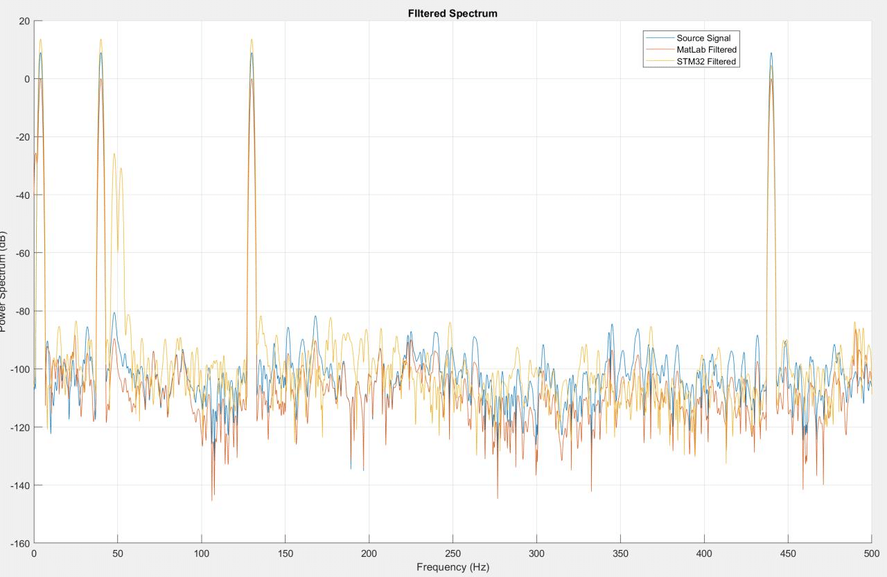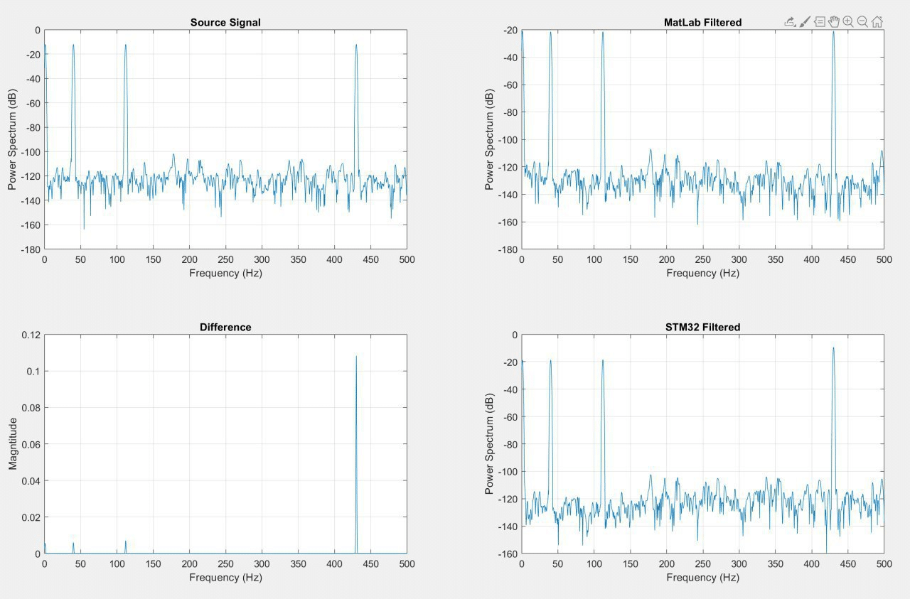 To verify the implemented filters, I generated a test signal and passed it through the filter in MatLab and on the microcontroller. The STM32Cube Integrated Development Environment allows me to access and export specific areas of the microcontroller’s memory (See Figure 4). I copied the filtered signal from the microcontroller and plotted the spectral analysis alongside the MatLab signal. When the gain was set of 0 for all bands, the filter performed identically to the MatLab model (see Figure 5). Encouraged, I tested the attenuation at -9dB across all bands and discovered that the microcontroller signal was deviated significantly from the MatLab signal, indicating a significant difference in code performance (See Figure 6).
