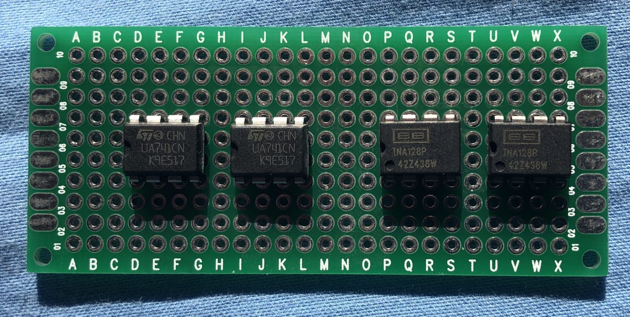 Due to the scale of these bioelectric signals, significant amplification is required to acquire and quantize these impulses with an Analog to Digital Converter (ADC). An electromyogram (EMG) instrument features instrumentation and operational amplifiers that acquire input from electrodes connected across a muscle group through differential amplification. In a barebones EMG circuit, as depicted below, the skin electrodes are connected to the non-inverting instrumentation amplifier inputs. Signals common to both electrodes are attenuated by connecting the inverting outputs of both amplifiers to the amplifier output. This negative feedback loop helps isolate EMG noise from signals common to both inputs such as capacitively coupled AC powerline noise. The final amplifier is used to scale the output of the instrumentation amplifier to fall within the majority of the ADC range and mitigate saturation.
