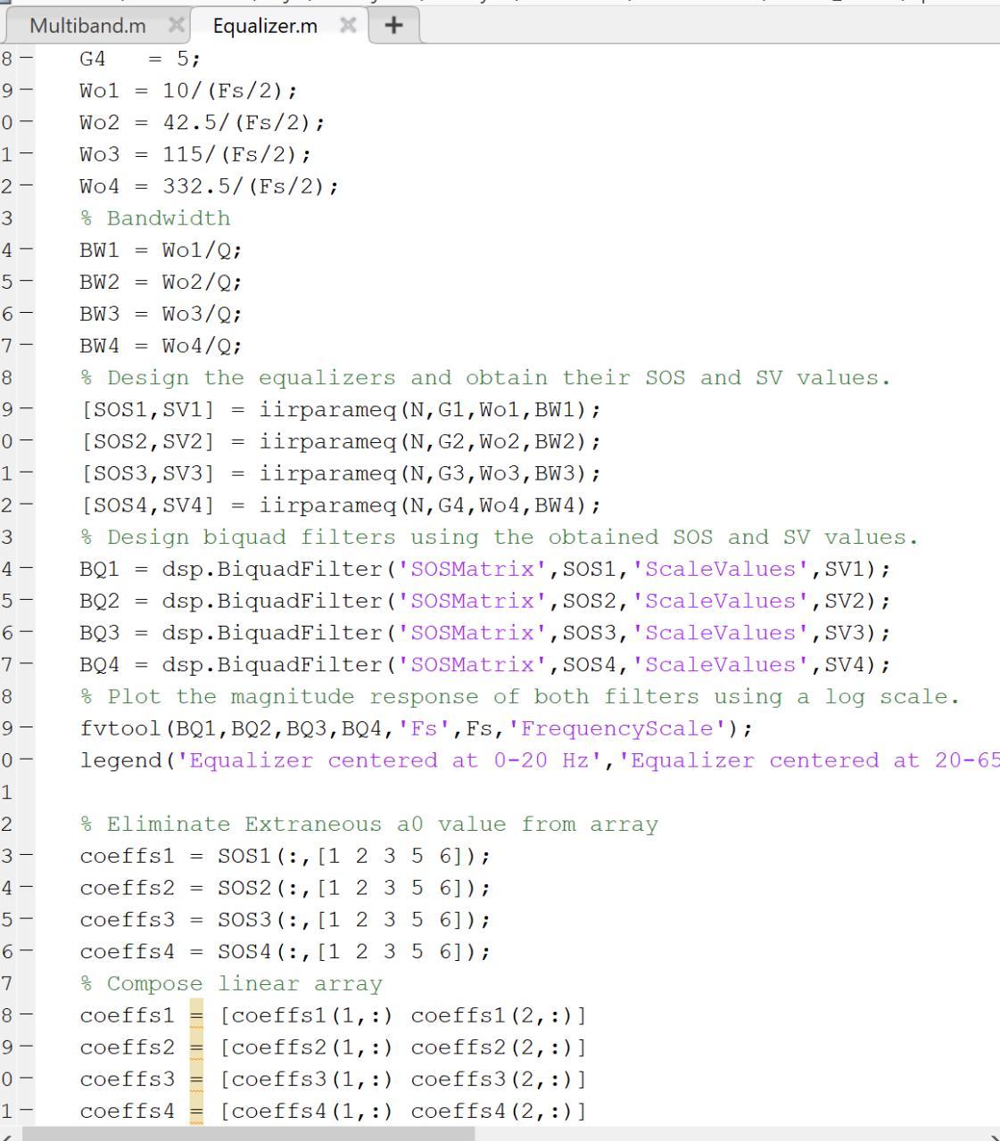 - I stumbled across an example for how to implement a graphic audio equalizer. Although, the sampling rate is substantially higher than the range I am working with the procedure is much more elegant! Based on the “gain” value stored in memory for each band, the function pulls the relevant filter coefficients from a table of all possible filter coefficients and then applies the first filter stage to the signal. The output of this stage is fed to the next and so forth until the equalized signal is output.